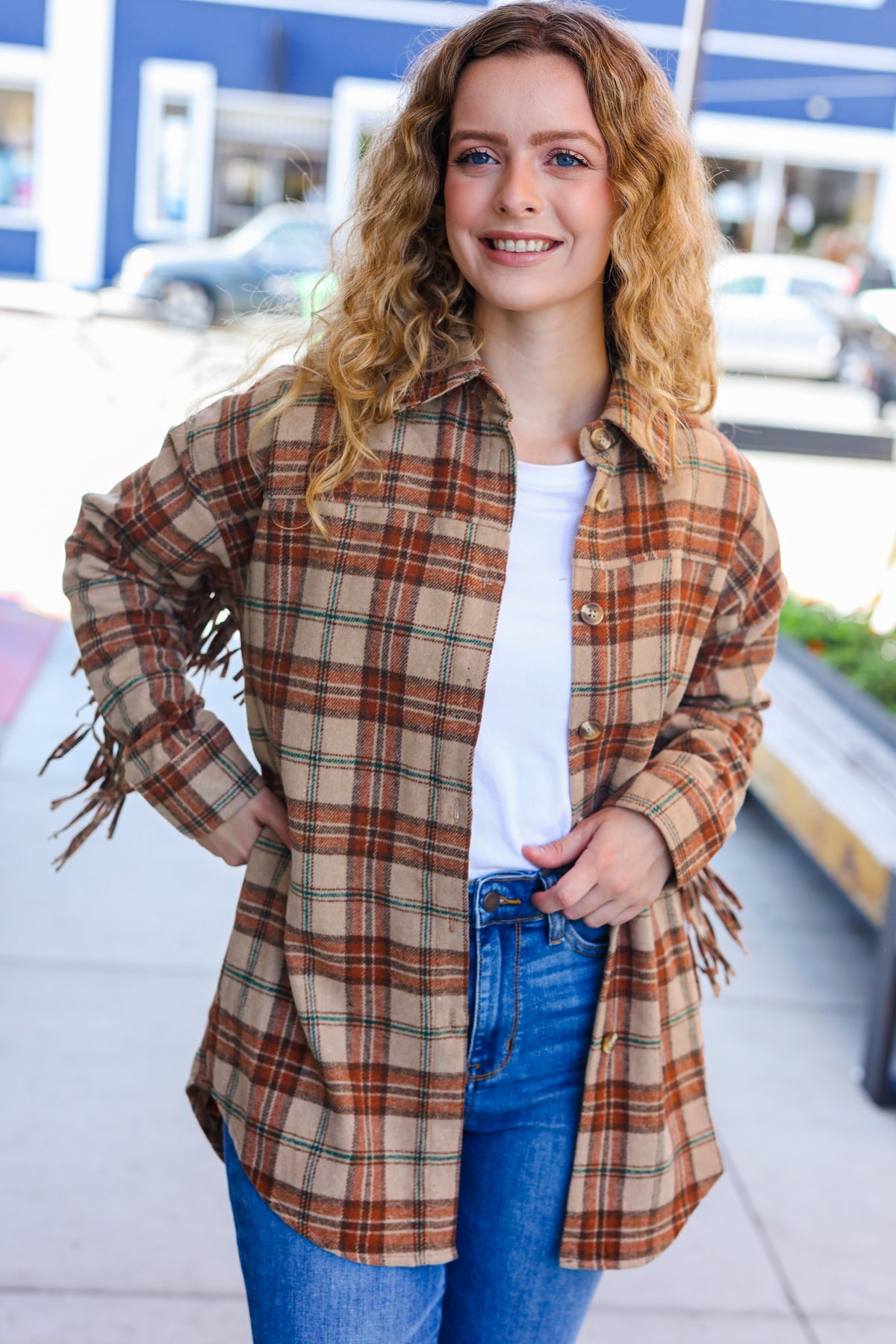 Plaid is rocking it this season, and this yarn dyed mid-weight oversized collared shacket with long sleeve button cuffs, fringe details and side pockets will not disappoint.