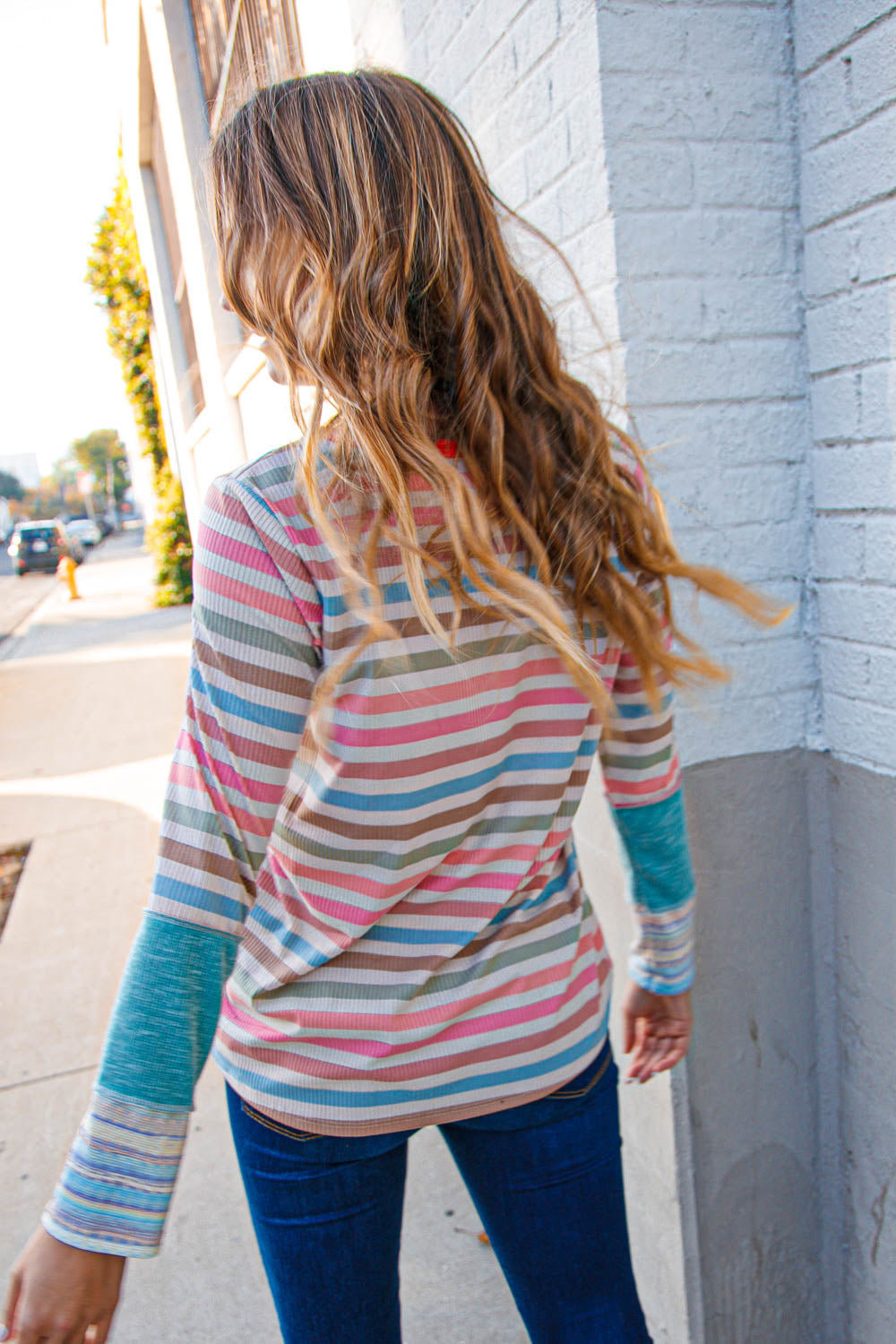Get instant color with this coral and taupe multistrip ribbed top featuring out seam reverse stitch details and two-tone sea foam long sleeves. Step into warmer weather with this striking top.