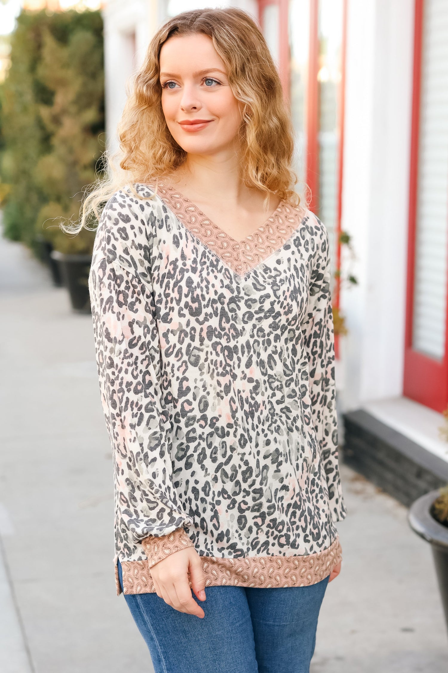 Get effortless on-trend style with this animal print V neck French terry top that combines animal and paisley print to give you everyday style.