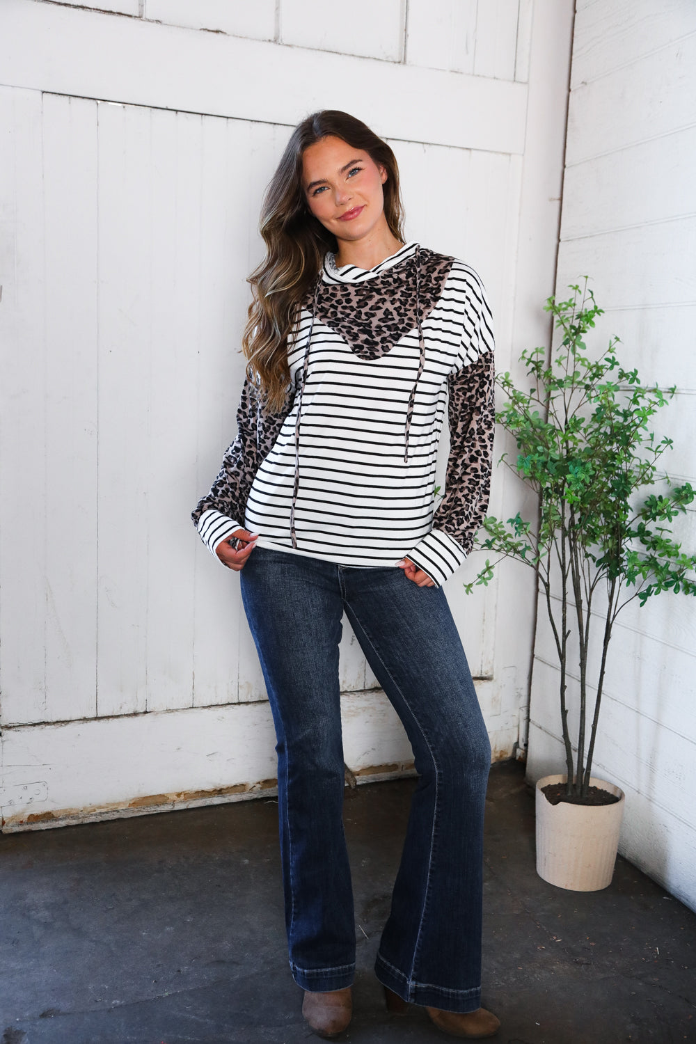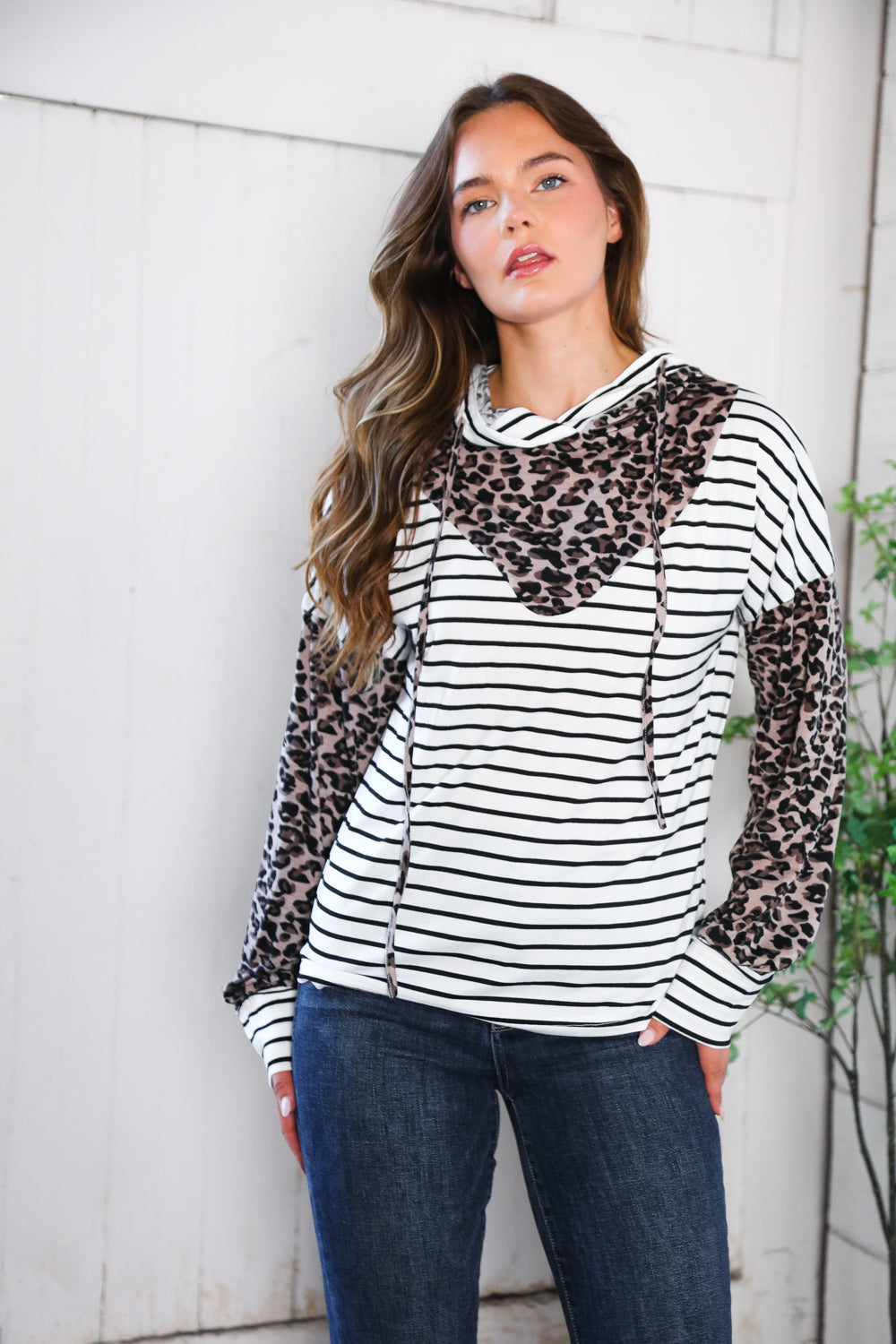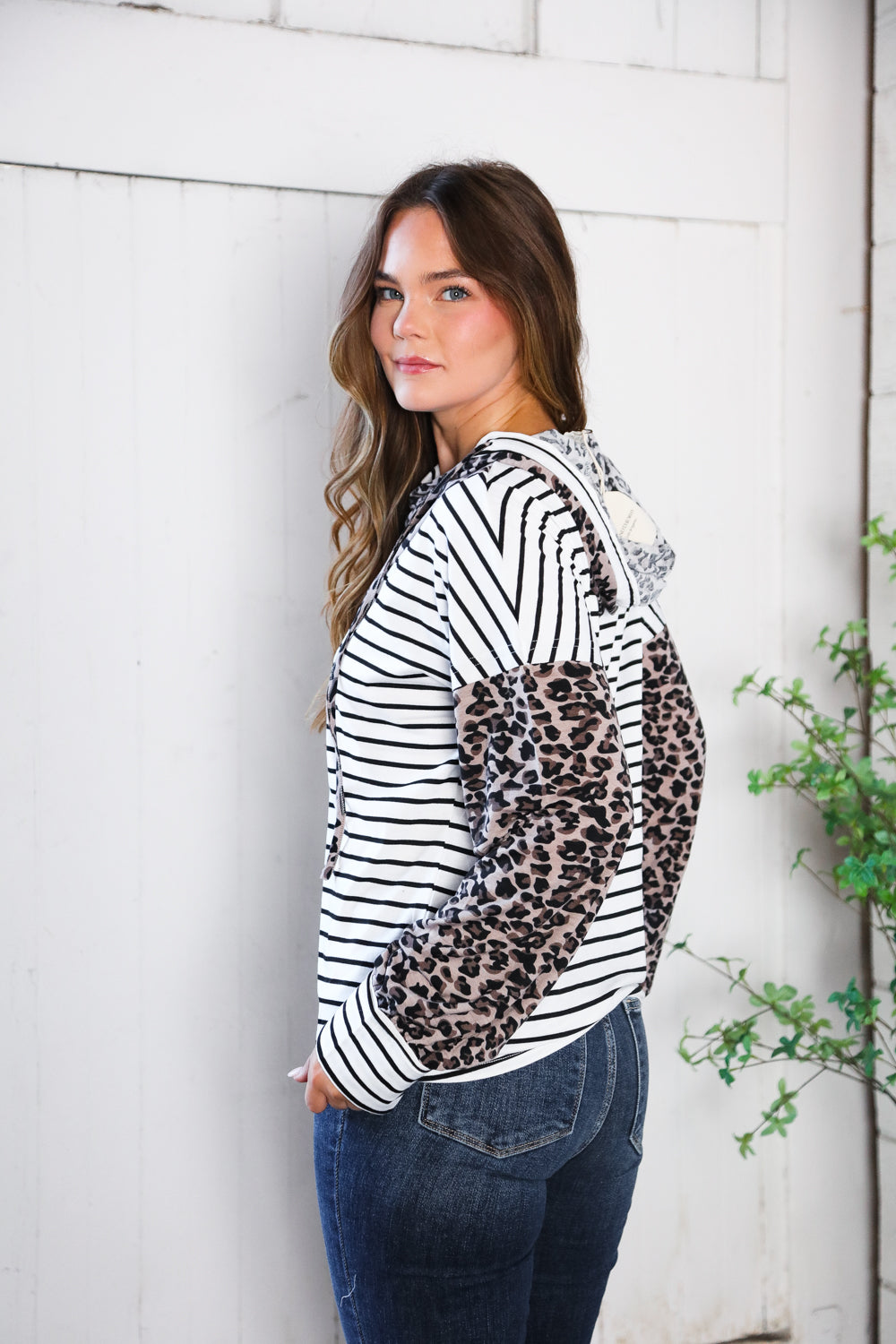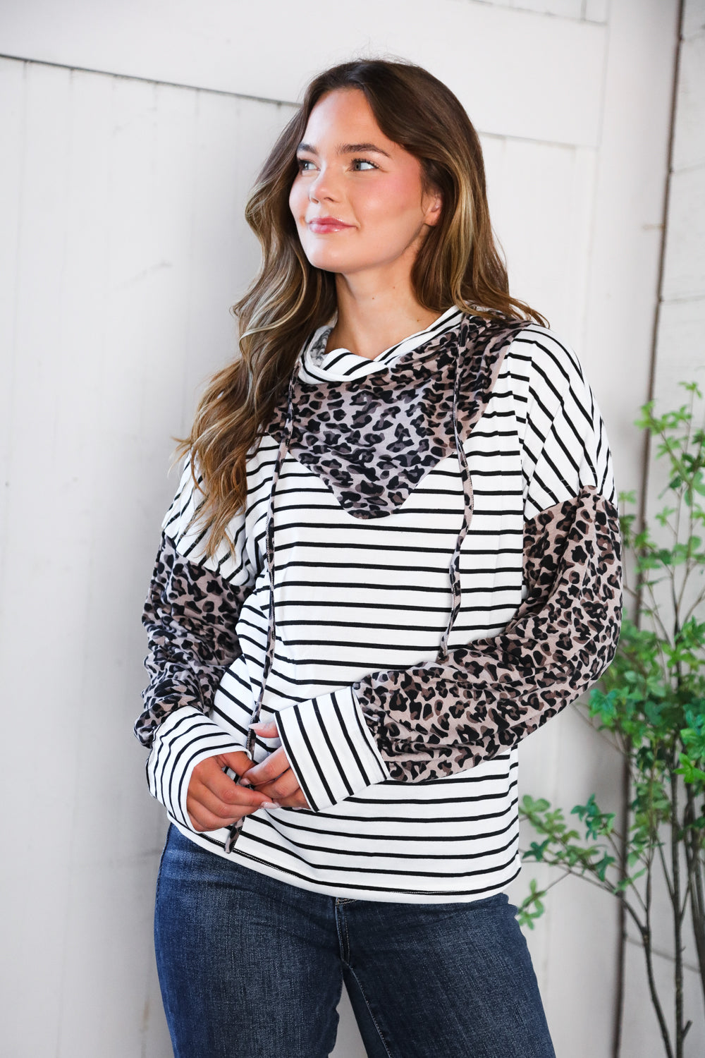 This hoodie perfectly combines our favorite animal and stripe prints. It is soft, stretchy and light weight. A great piece for running errands or casual nights out.