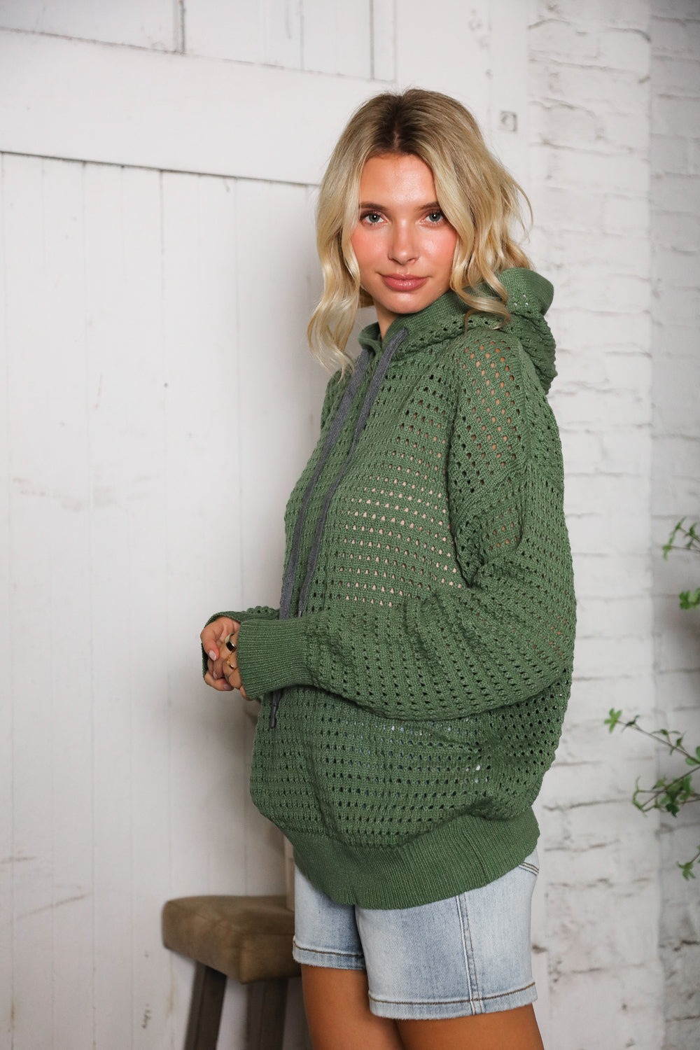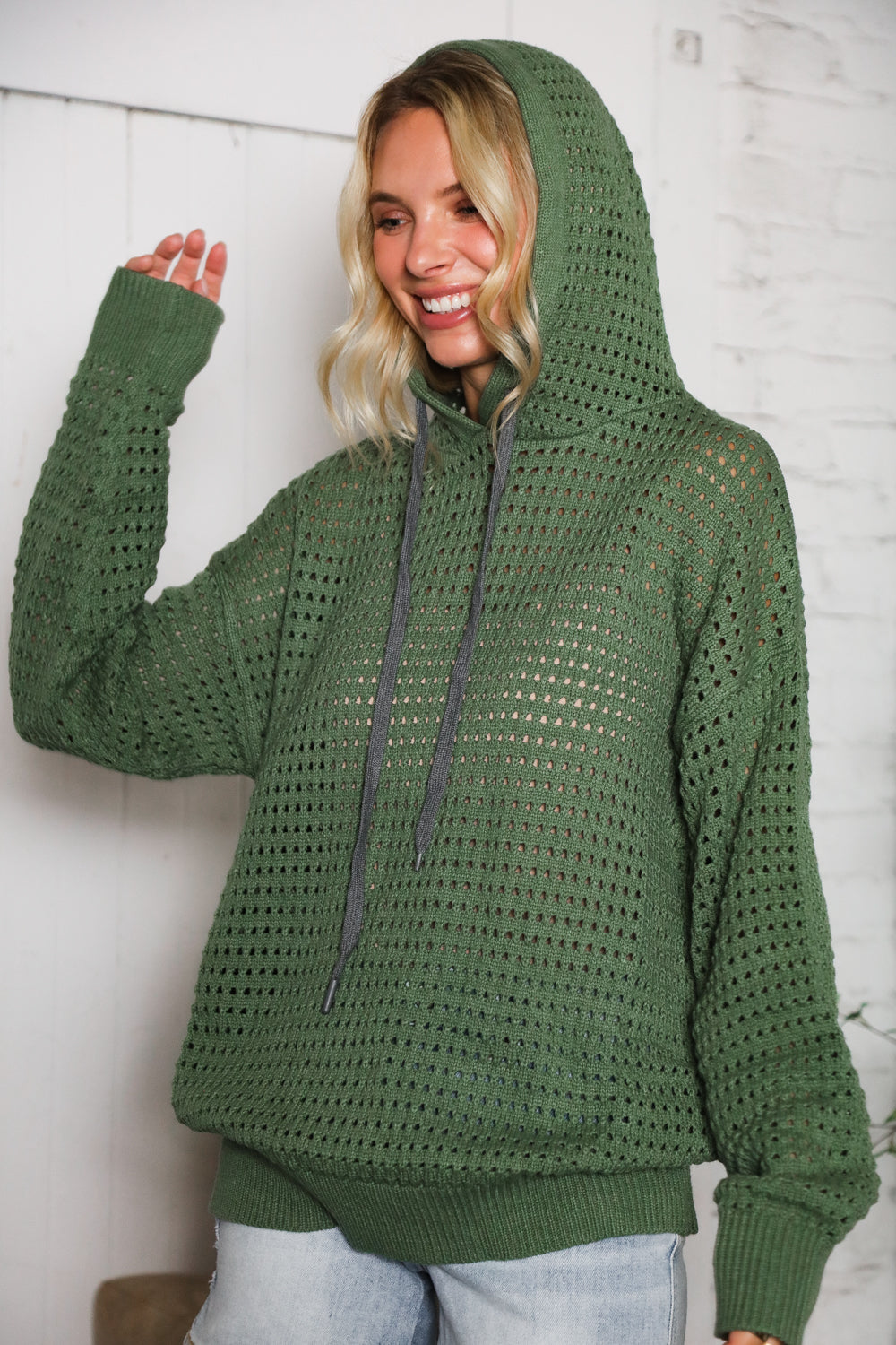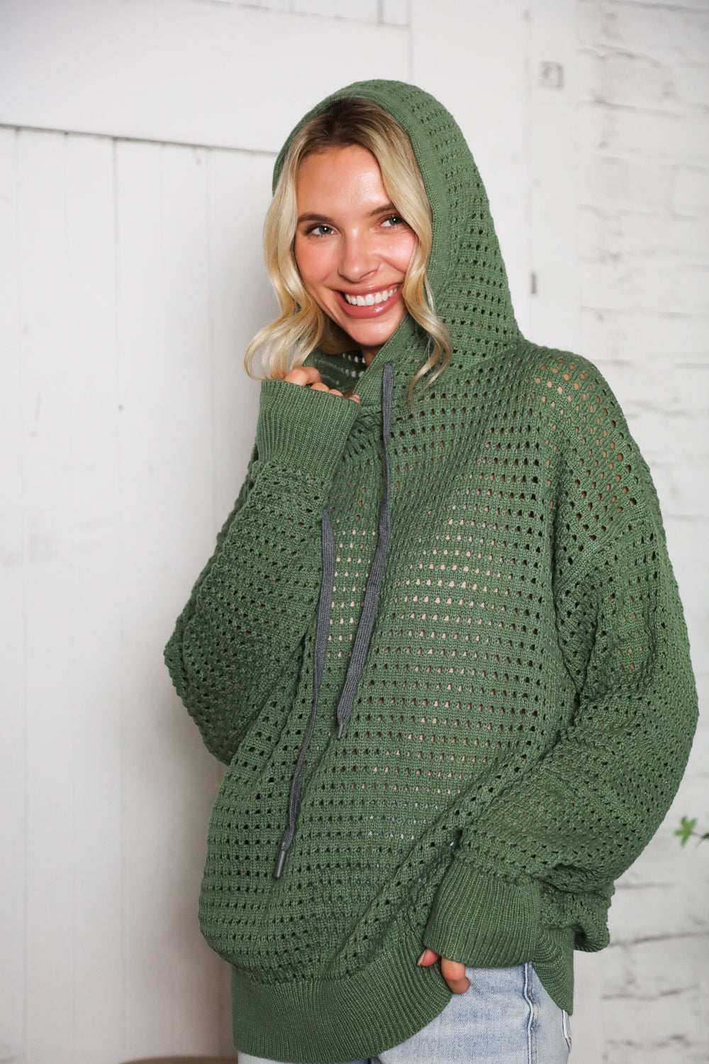This knit hoodie is such a easy throw-on piece for the season. We love how it’s made with an open weave, so it’s not too heavy but still gives that cozy layered look. The olive color is super versatile. We’ve been wearing it with jeans but it’s cute tossed over leggings too. The fit is relaxed with a little slouch.