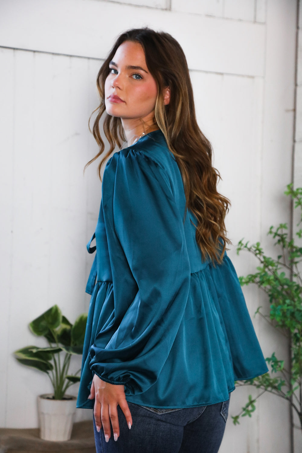 This satin top is such a pretty statement piece. The deep teal color is perfect for fall and it works great for the holidays as well! It’s got three sweet little bow ties down the front that give it a feminine and cute touch. The fabric has that smooth, silky feel that drapes so nicely. The flowy fit is comfortable and still looks polished. We like pairing it with dark denim and boots for a dinner out..